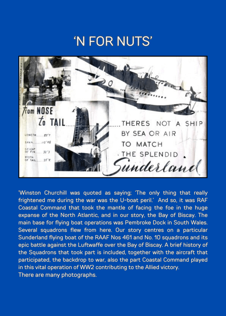 Besides telling the story of the epic battle, the survival of ‘N for Nuts’, and the crew’s aftermath, the narrative provides a historical account of the Squadrons that took part, a history of the Short Sunderland, including other flying boats that operated from Pembroke Dock, and the part Coastal Command played in bringing the war to a close.